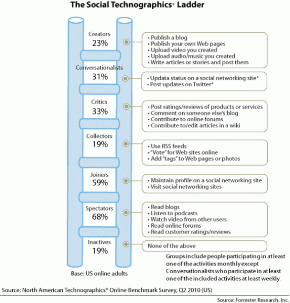 L’échelle “social technographics” du cabinet Forrester est un outil précieux qui permet de mieux qualifier les différents modes d’interaction en ligne et d’observer leur évolution au fil du temps.