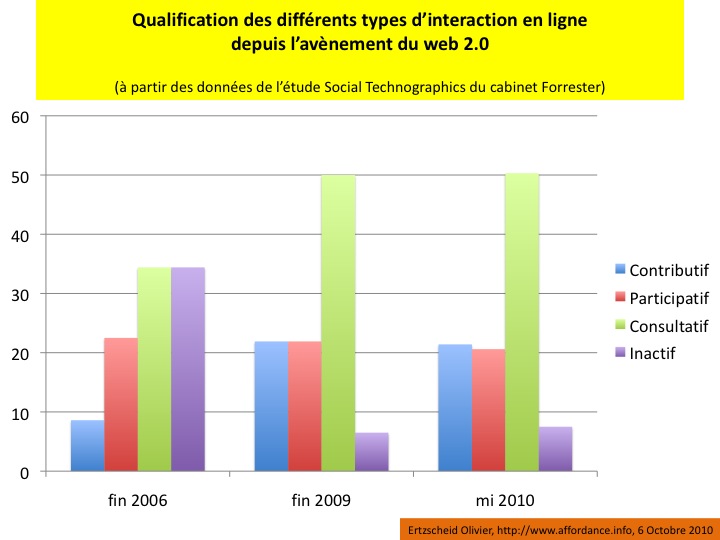 Participer, collaborer, contribuer, le web 2.0 permet différents modes d'interaction. Mais depuis 2006, les comportements en ligne ont changé. Olivier Ertzscheid analyse leur évolution à l'aide de l'échelle "social technographics" du cabinet Forrester.