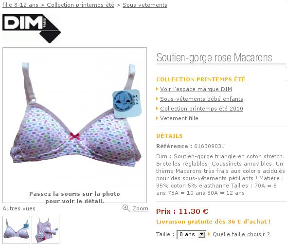Le compte-rendu de mes pérégrinations est sans appel : la quasi-totalité des grands magasins dotés de rayons lingeries pour les enfants vendent eux aussi des soutiens-gorges rembourrés. On y trouve ainsi des modèles taille 65A, à destination des petites filles de 8 ans, mais également des modèles tailles 70 et 75B, à l’intention des 8-10 ans :