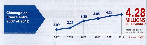 Les chiffres présentés par le PS correspondent à ceux relevés par la Dares qui dénombrait 4,2786 millions de demandeurs d’emploi en février 2012 (dernières données disponibles) ; 3,840 millions en décembre 2009 ; 3,249 millions en décembre 2008 et 3,093 en décembre 2007.