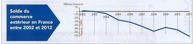 Le dernier graphique présenté par le PS sur son tract n’est pas très précis : les valeurs ne sont pas indiquées, seule l’échelle de gauche permet de donner une idée du montant du solde du commerce extérieur en France.