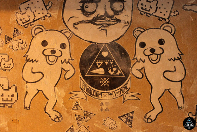 Enfin, les réseaux sociaux ne sont pas les seuls à inspirer les street-artistes, en effet la culture Internet n’est pas en reste avec cet exemple ci-dessous réalisé par Thierry Jaspart, en Belgique. Il a décidé de réaliser une fresque mettant en scène nos amis connus d’Internet, j’ai nommé Rage Faces, Pedobear, Long Cat, Keyboard Cat, etc.