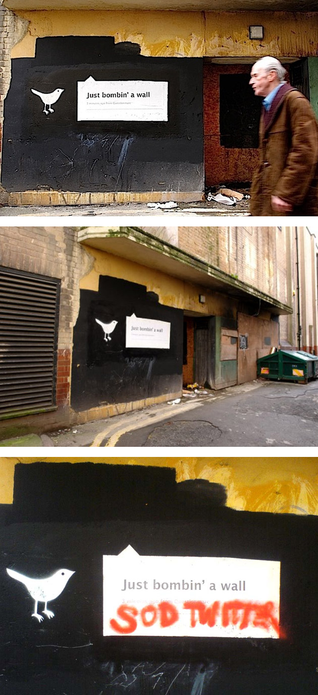 Un autre artiste du nom de “Questionmarc” s’xprime sur les murs les d’un bâtiment en mettant en avant le petit oiseau de Twitter (l’ancienne version, pas la nouvelle). Son tweet ? “Just bombin’ a wall” est très simple et je serais ravi de voir jusqu’où il pourrait aller avec ce petit oiseau et ces tweets.